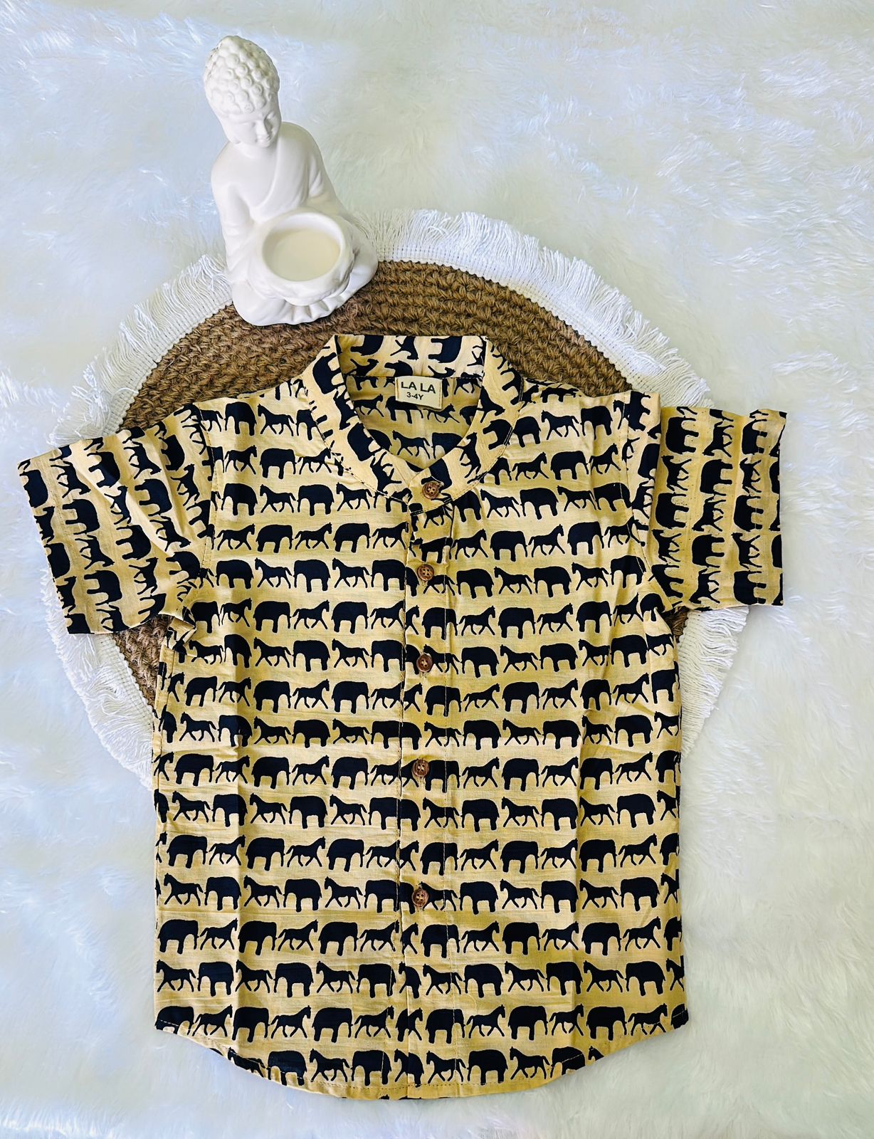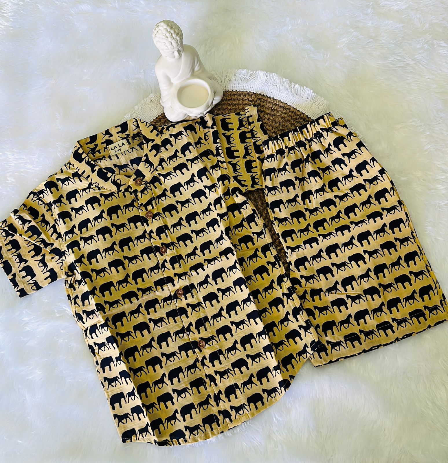 Dress your little one in timeless charm with our Sandal Jungle Print Co-Ord Set from Lala Kiddo. Perfect for festive celebrations and special occasions, this shirt blends classic elegance with everyday comfort. Crafted from soft, breathable cotton, it feels gentle on the skin while keeping your child comfortable all day. Shorts feature a covered elastic waistband for extra comfort and long-lasting wear.